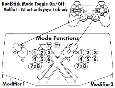 DualStick Mode makes the second player joystick of a dual X-Arcade™ act like the right analog thumbstick on a gamepad. But it also makes the buttons on the player 2 side mirror those of the player 1 side, so the buttons on both sides can be used for single-player game play. As you may have gathered, this means that DualStick mode is for single-person game play, and requires a 2-player X-Arcade™ controller, it will have no effect on an X-Arcade Solo™ for example.